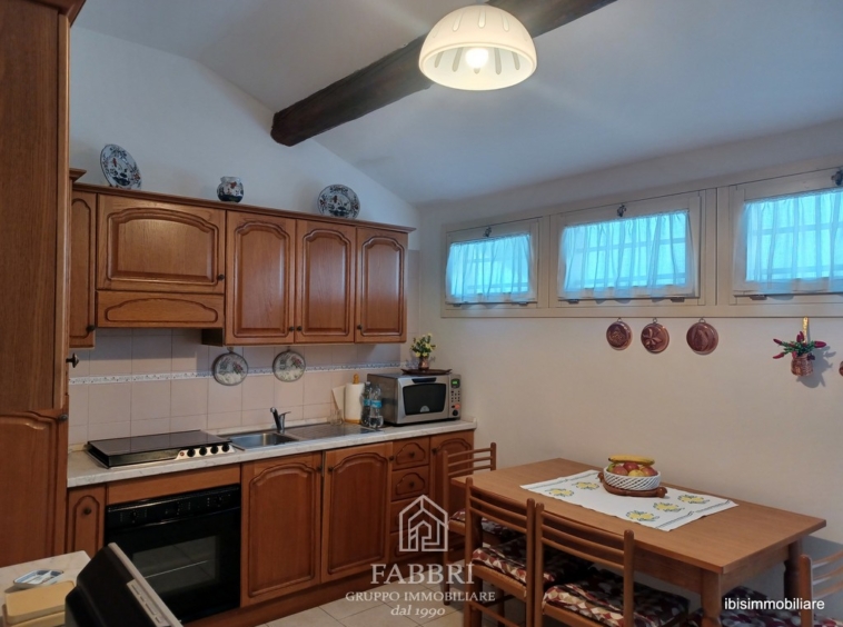 La cucina abitabile, pensata per gli amanti della gastronomia, è dotata di ogni comfort e include un piccolo terrazzino, ideale per un caffè mattutino all’aria aperta, e una pratica zona dispensa, che garantisce funzionalità e organizzazione ottimale.